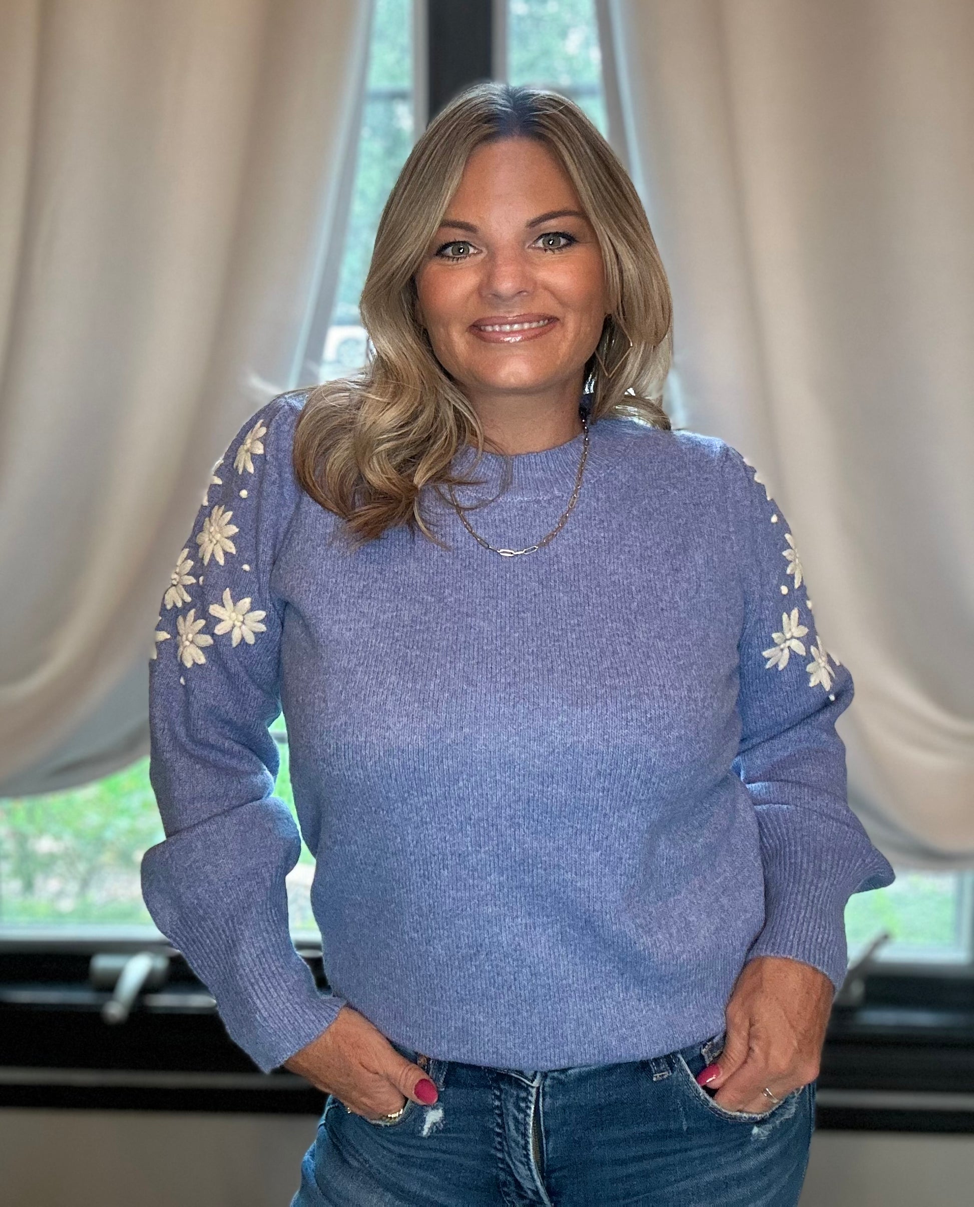 Get ready to bloom with style in our Blue Floral Sweater! This playful piece features embroidered flowers on bubble sleeves for a fun twist on a classic sweater. Perfect for adding a touch of quirkiness to any outfit.