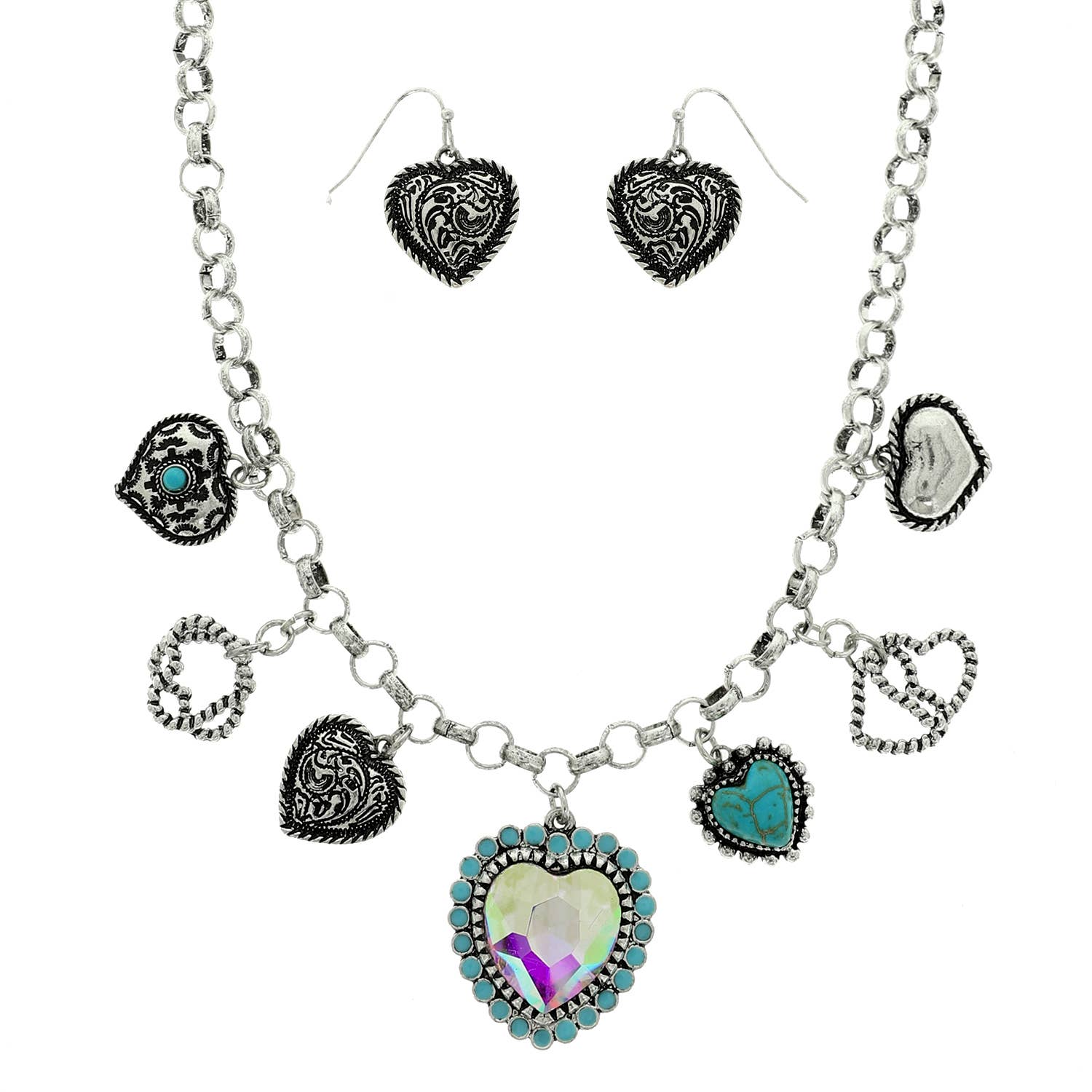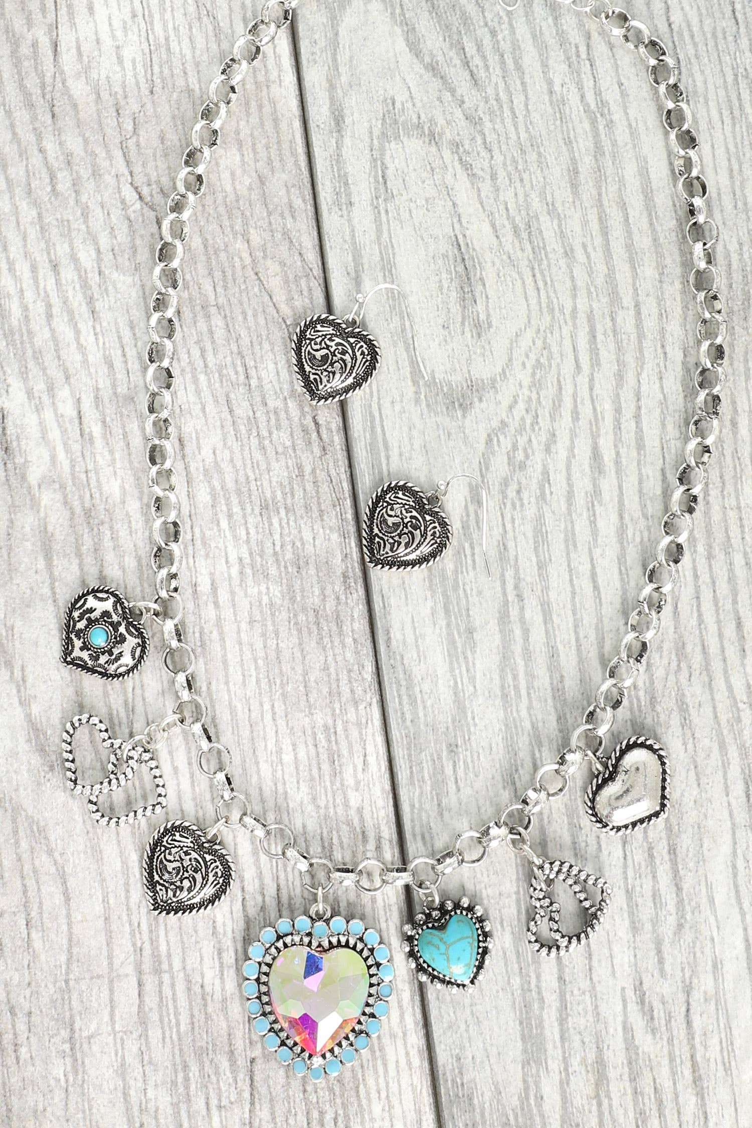 This Western Theme Heart Pendant Necklace Set features a unique design that showcases your love for the Wild West. Made with high-quality materials and intricate details, this necklace set is perfect for adding a touch of western charm to any outfit. Upgrade your jewelry collection with this must-have accessory. LENGTH: 18" EXTENSION: 3" DROP: 1.4" EARRINGS: 1"