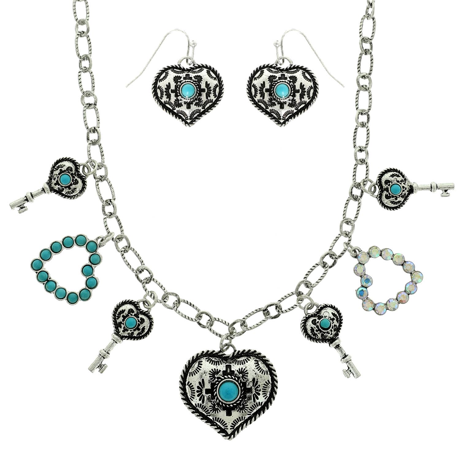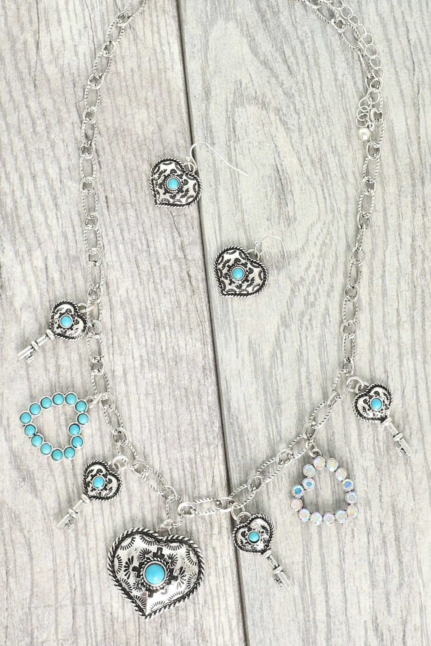 This Western Theme Jeweled Heart Charm Necklace Set offers a touch of elegance to any outfit. Featuring stunning, intricately designed heart charms, this set brings a sense of romance and charm to your style. The perfect accessory for those who appreciate unique and timeless pieces. LENGTH: 18" EXTENSION: 3" DROP: 1.15" EARRINGS: 1"
