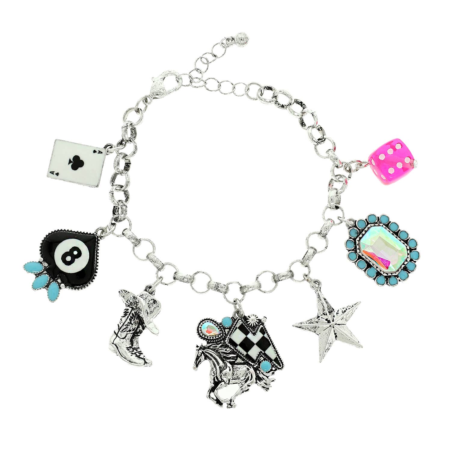 Experience the Wild West with our Western Theme Multi Charm Bracelet. Featuring a variety of Western-inspired charms, this bracelet is the perfect accessory for any cowgirl or cowboy. Show off your love for the Wild West and add some rustic charm to your style. LENGTH: 8" EXTENSION: 1.5" WIDTH: 0.25" CHARM: 1.25"